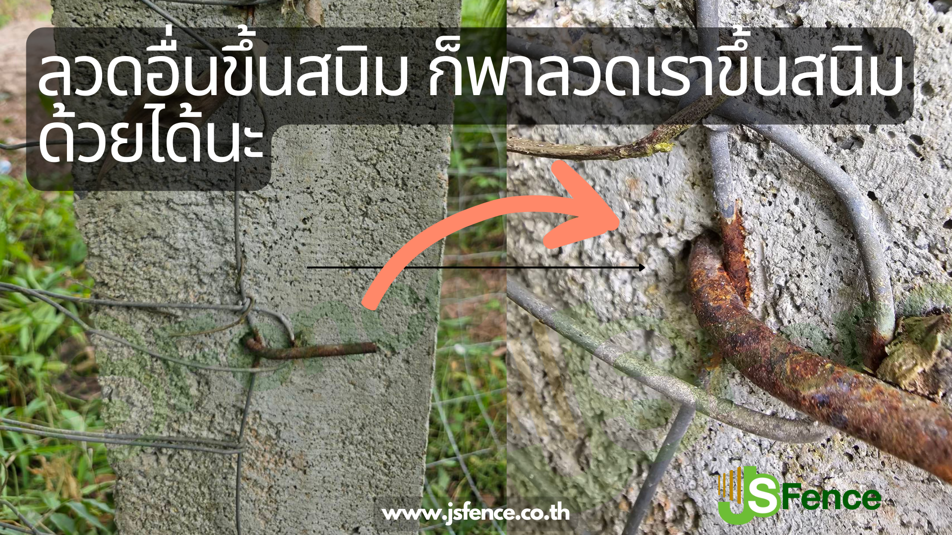 ภาพนี้ทีมงาน JSFence เราได้มีโอกาสไปเยี่ยมลูกค้าที่ซื้อรั้วตาข่ายของเราไปติดตั้งเองนะครับ โดยนำเส้นลวดรั้วตาข่ายของเราไปคล้องไว้กับเหล็กที่ฝากไว้กับเสาปูน เพื่อที่จะได้ไม่ต้องพันลวดกับเสาปูน แต่บังเอิญเหล็กที่ฝากไว้กับเสาปูนนั้นเกิดสนิมขึ้น ทำให้สนิมนั้นเหนี่ยวนำให้ลวดของเราเป็นสนิมไปด้วยครับ